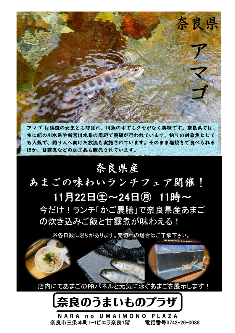 渓流の女王と呼ばれ、川魚の中でもクセが無く美味しいとされるあまごを、「奈良のうまいものプラザ」にて、炊き込みご飯と甘露煮で味わえます!