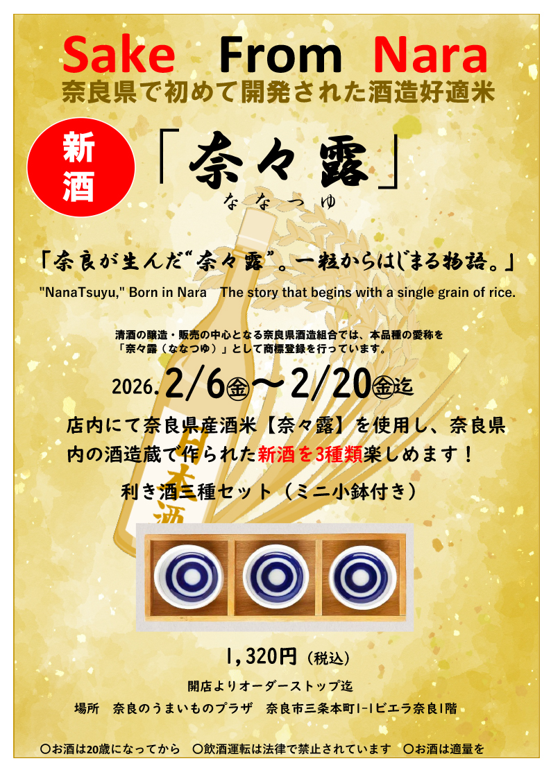 イベント情報 ツイート 2026年2月6日(金)~2026年2月20日(金) 奈々露の新酒フェアを開催します! 奈良県産酒米「奈々露」を使用し、奈良県内の酒造蔵で作られた新酒3種を店内にて楽しめます! 日時 令和8年2月6日(金曜日)~20日(金曜日) 7時~21時(LO 20時30分) 内容 奈々露の新酒を使った利き酒三種セット(ミニ小鉢付き)を提供します。 利き酒三種セット(ミニ小鉢付き):1,320円(税込) 場所 「奈良のうまいものプラザ」(JR奈良駅1階) (奈良市三条本町1-1 ビエラ奈良1階) お問合せ先 奈良のうまいものプラザ(☎0742-26-0088)